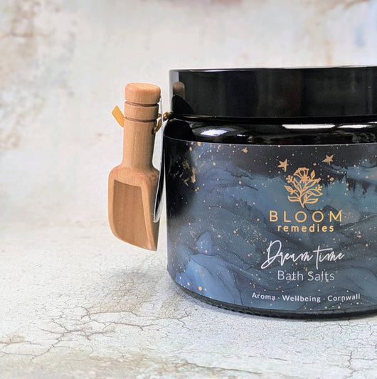 With skin softening Himalyan and Dead Sea Salts, blended with Ylang Ylang, Geranium, Sweet Orange, Cedarwood, Lavender and Patchouli essential oils to encourage relaxation and deep sleep. The salts and are presented in a luxurious heavy amber glass jar and mini wooden spoon.