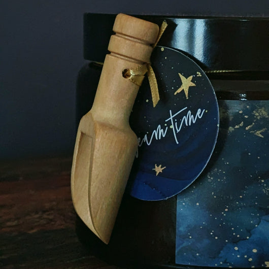 With skin softening Himalyan and Dead Sea Salts, blended with Ylang Ylang, Geranium, Sweet Orange, Cedarwood, Lavender and Patchouli essential oils to encourage relaxation and deep sleep. The salts and are presented in a luxurious heavy amber glass jar and mini wooden spoon.